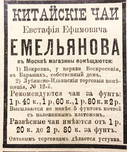 Василий Перлов с СыновьямиСергей Васильевич ПерловИ. и В. РудневыВ.Высоцкий и К°Петр Соловьев с СыновьямиПреемник Алексея Губкина А. Кузнецов и КºКонстантин Ефремович КиселевВасилий ОрликПетра Боткина СыновьяВогау / КараванК. и С. ПоповыИван Егорович ДубининЕгор Иванович Некрасов и СыновьяА.В.РотермундСергей Алексеевич СпоровА.В.ШвецовАлександр Александрович МусатовСергей Васильевич БлинниковБратья Ф. и А. ШемшуриныНиколай Михайлович СолдатовОскар Богданович ПилацкийНиколай Иосифович Корещенко, Ольга Арсеньевна КорещенкоКноп и КастеринМ.Д.СкрипакаевП.М.Кузмичев с Сыновьями (P. M. Kousmichoff & Fils, Kusmi)Морис Людвигович РоживюАлександр Прохорович СеливановскийФ. и Н. АплаксиныМихаил Прокофьевич МедведевЧай КяхтинскийИван Николаевич ФилипповД. и А. РасторгуевыВасилий Гаврилович КлимушинИлья Федорович ЧистяковМихаил Петрович БашкинНиколай Митрофанович СедаковВасилий Иванович ПоповЕгор Александрович ЕгоровИван Иванович ШмаковИван БарановВасилий Сильвестрович КандинскийВасилий Иванович ГрязновБратья ЗензиновыАфанасий Дмитриевич СтупинАлександр Никанорович КириловНиколай Андреевич ПеченовНаследники П.С.Каптелина и К°Петр ОрловА.И.ШестаковКапырин Николай ФёдоровичЩетинин И.ЦейлонУ.Якуб с Сыновьями и К°Д.А. и Г.Дементьевы, П.В.Васильев и К°Братья В. и Н. Поповы и К°Семен Петров БриллиантПавел Васильев ЛаврентьевАндрей Афанасьев ОрловМ. М. ЛевенсонБратья БобровыИван Семенович ГорячевАлексей Васильевич АндреевД.Я.ГущинА.И.Сергеев и КºЕ.С.Челнокова с СыновьямиГригорий Васильевич ЗарайскийН. и П. ПоповыНиколай Васильевич БасмановВасилий Иванович ГолубковПетр Петров ГолубковМихаил Флорович ГубаревИван Дмитриев СеребрениковИван Ларионович ГолубевИван Иосифович КорещенкоИван Никифоров ГорюновПетр Дмитриев СолодовниковНиколай Николаев УлановАлексей Герасимович КадушкинА.Ф.ТретьяковГ.ЕфимовАндрей Григорьев КантаржиОнисим Фролович НечаевМихаил Гаврилов КлимушинВасилий Дмитриевич СеребрениковВасилий Прокопьев МедведниковА. СтратониковПетр Емельянов ЛанговойПетр Николаев КоченовХаритовБаранниковМатвей Михайлов БоткинАлексей Иванов СмирновПавел Николаевич ИгнатьевВасилий БажановИван Иванович КарзинкинП.В.ГригорьевПетр Лебедев (М.И. Корещенко)Белявский Николай ФилипповИван Егоров Крюченков«Производитель»Василий СкрипниковЦзинь-ЛунОсип ЖильцовКрутов Алексей АндреевичХын-Лун-ГоА. Л. Семенов и К°Н. И. Самойлов и К°Н. К. ШурКишин Хаим Рафаил ШмуиловичСергей Александров ОрловШелагин Алексей ЕгоровичСудариков Гавриил ПетровичБоткин Михаил ГавриловичКолесов Иван АлексеевичВ. А. и П. ШестовыИ. П. ЛобковРудаков Алексей ФедоровичКуманин Константин АлексеевичВ. Н. и П. Н. УсачевыА. А. КорзинкинКиндяков ВасилийП. Епанешников с СыномИ. С. ТихомировНиколай Николаевич ХлебниковПетр Иванович БакастовНиколай Мартемьянович ЧукмалдинН.П. АмеличевПавел Николаевич СусальниковН.А. ПерловКудинов Петр ИвановичАнуров Василий ДмитриевичКяхтаМ. Попов с СыновьямиМалюшин Иван ФедотовичД.Астахов и К°ЦентросоюзЧаеуправлениеН.П. МаттейсенБратья ПоповыН. Сергеев и А. РомановВасилий Григорьев МорковкинЕвстафий Ефимович ЕмельяновИ. Аленчиков и Н. Зимин